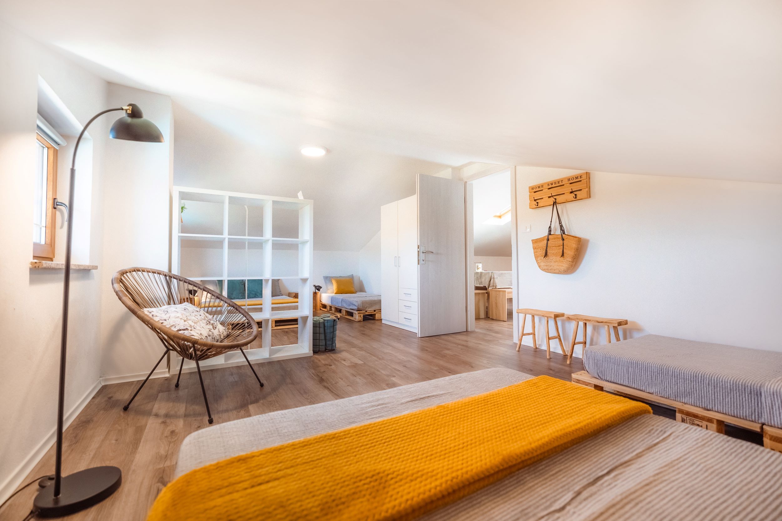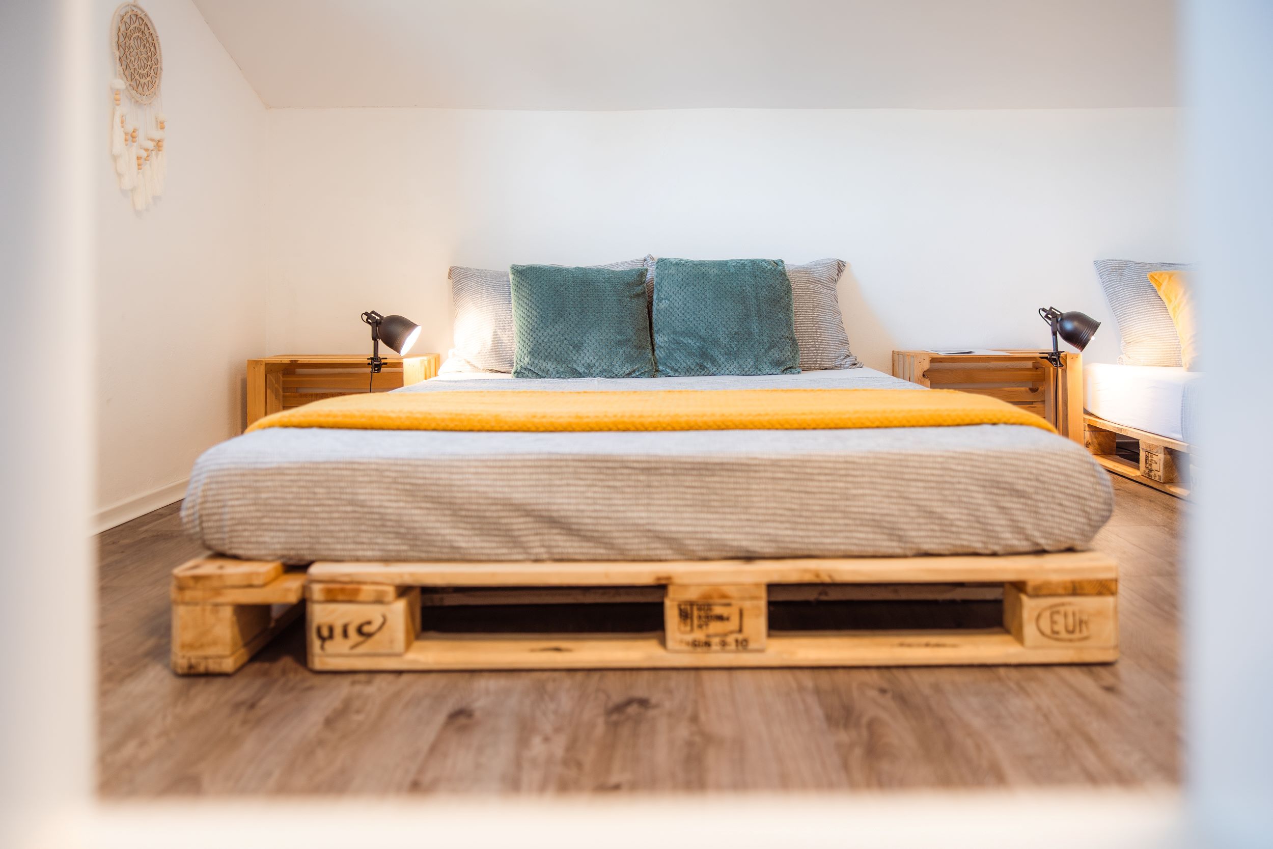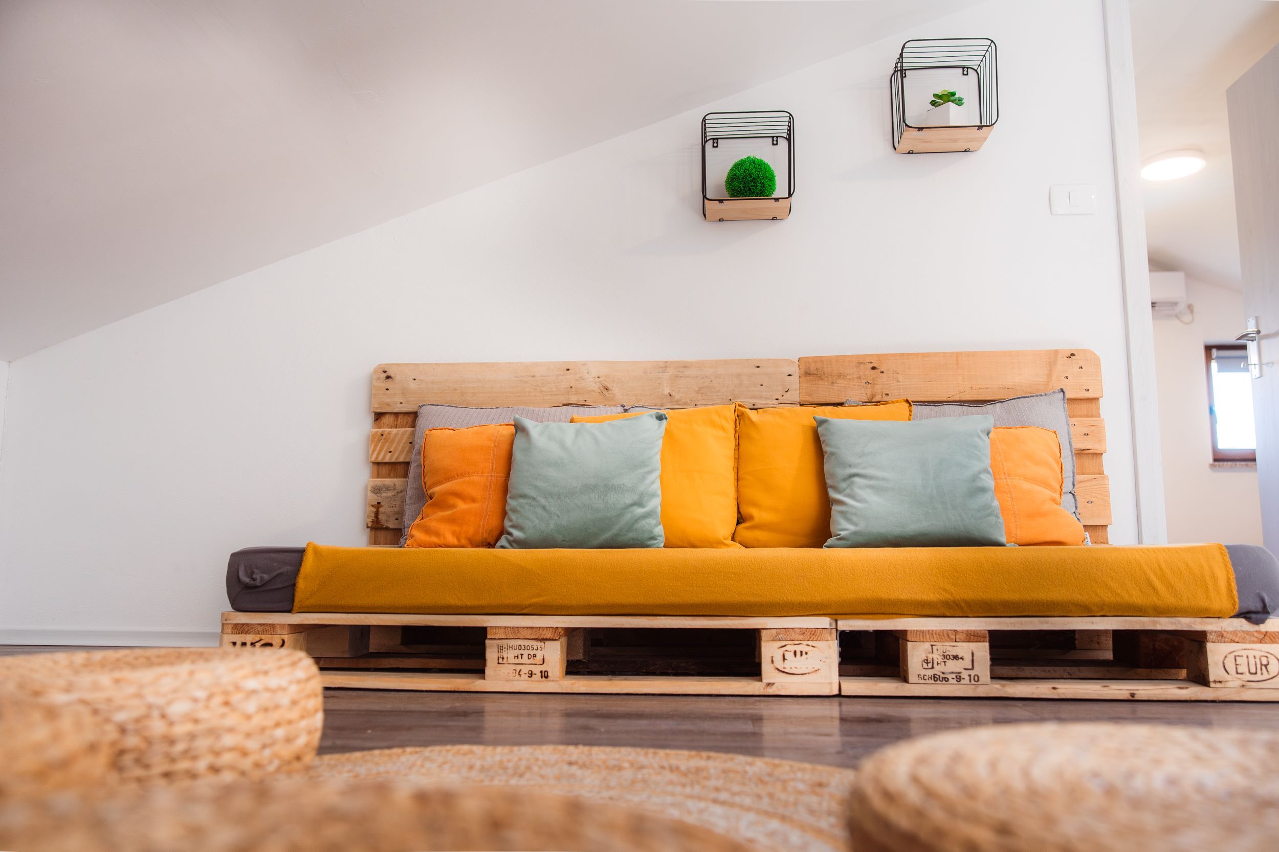 - dve enojni postelji iz palet 90 x 200 cm,