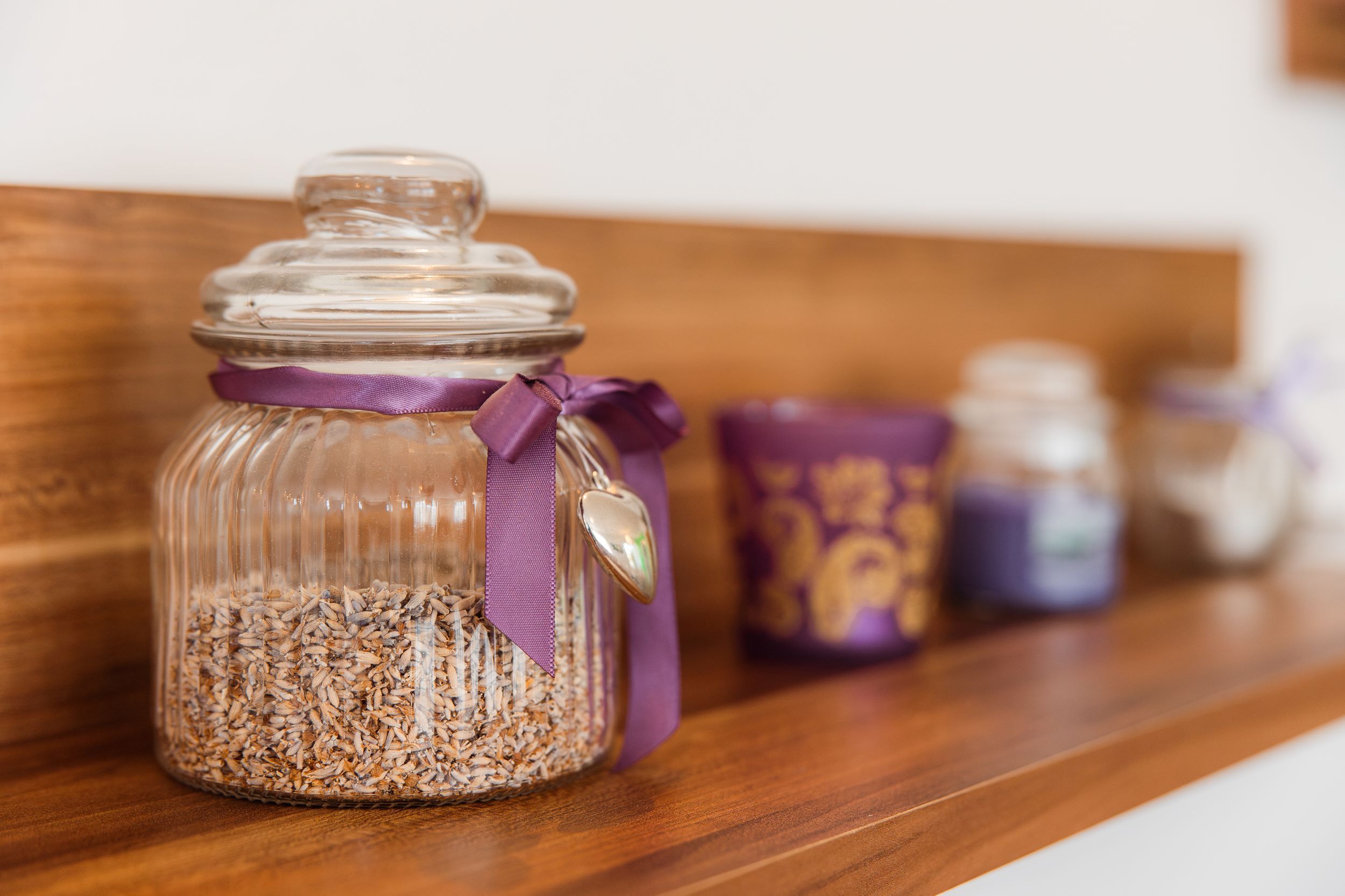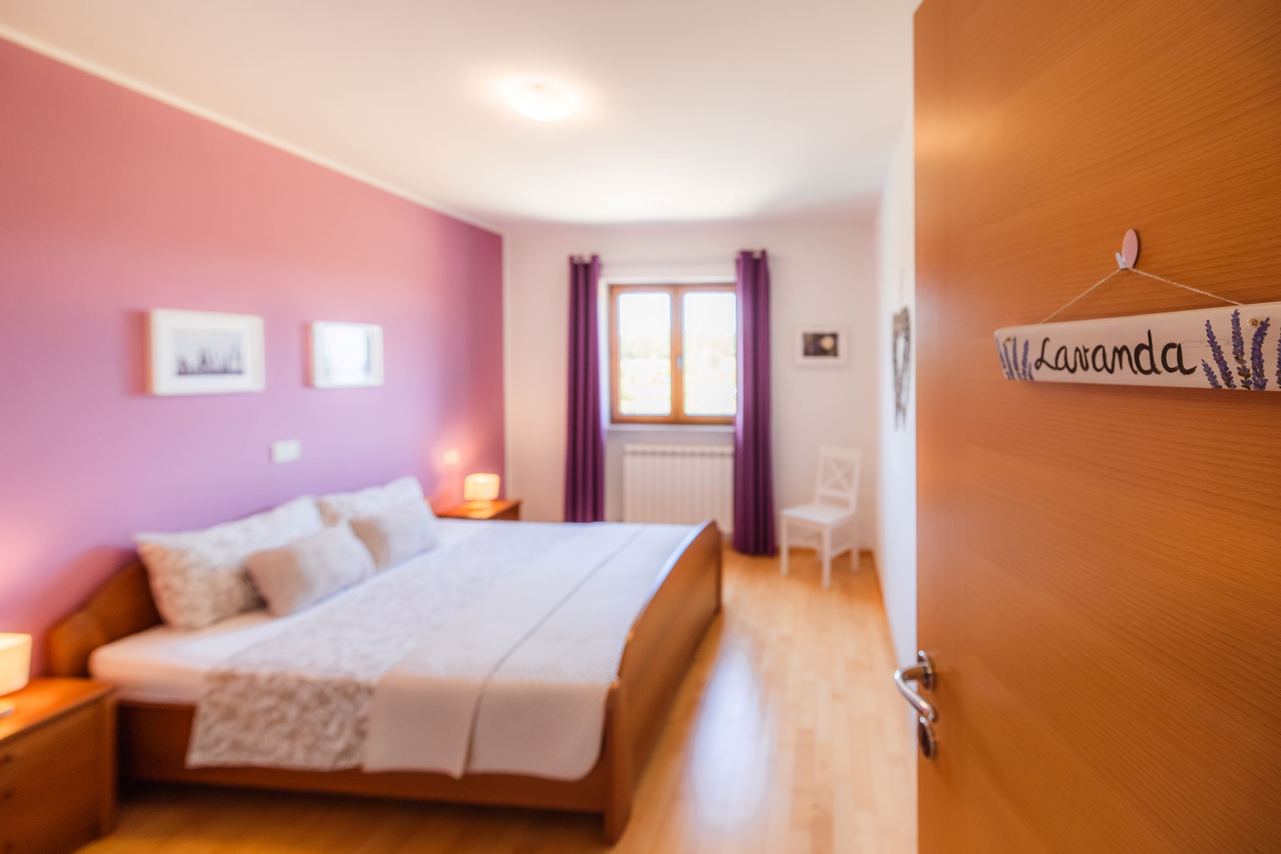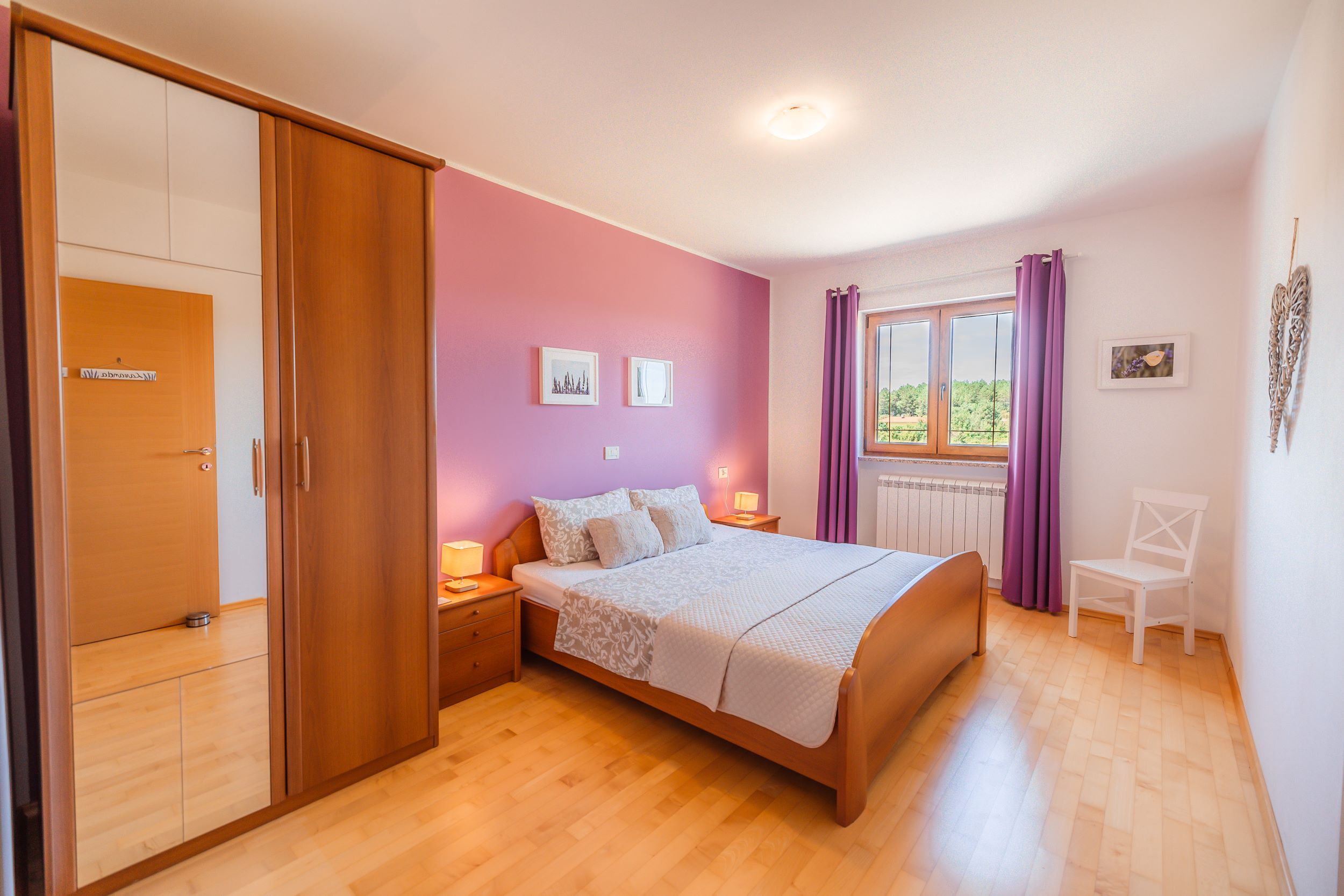Soba Lavanda: zakonska postelja 180×200 cm, 2 nočni omarici, garderobna omara z obešalniki.